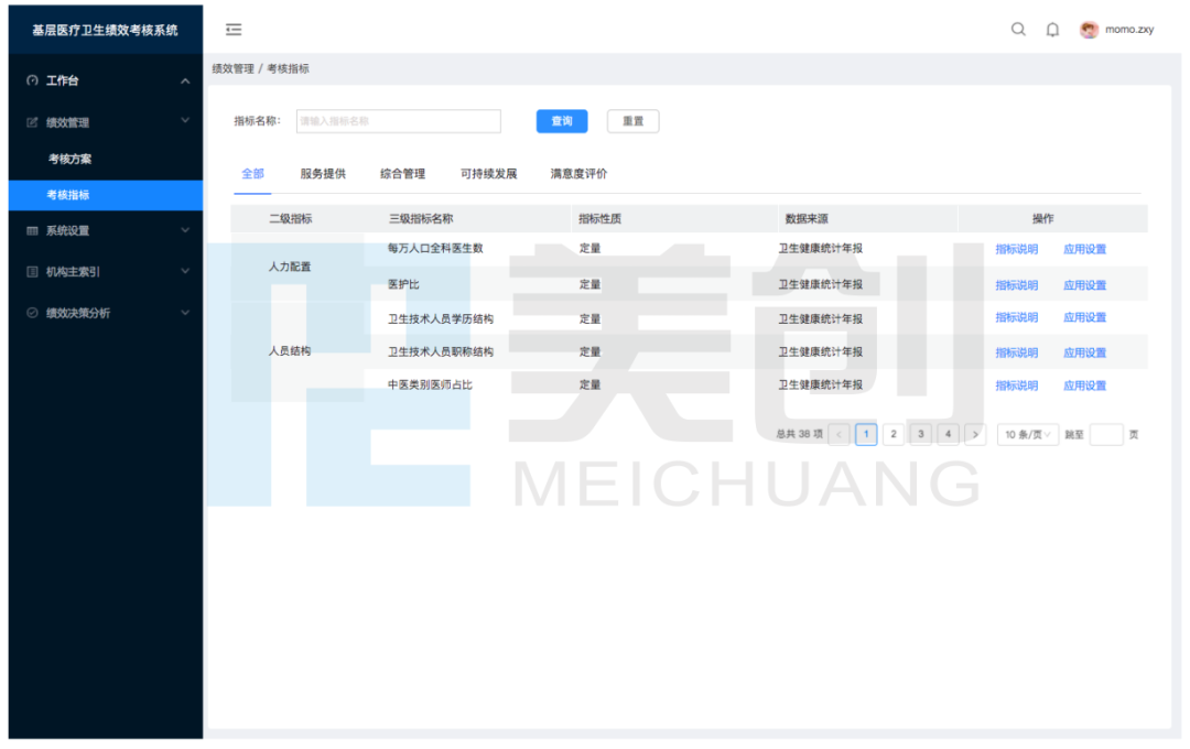 美创以《指导意见》等文件为标准,将绩效考核指标体系、统计要求、评分标准等固化在平台,内置4项一级指标、50项三级指标(定量+定性),支持考核流程、方案、规则等的灵活配置,可满足卫生健康管理部门对医共体、卫生健康管理部门对基层医疗卫生机构以及医共体牵头医院对基层医疗卫生机构的考核需求。