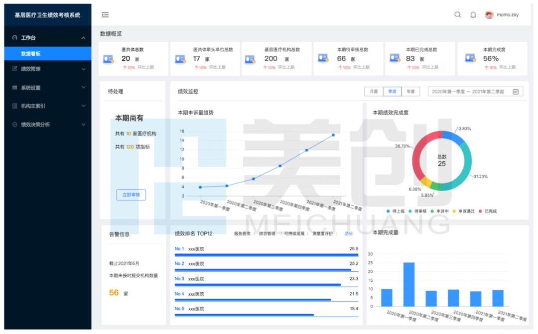 美创在严格遵照国家政策要求的基础上,面向卫生健康管理部门、基层医疗卫生机构、医共体牵头单位以及医共体的用户,推出【基层医疗卫生机构绩效考核平台】。平台在严格管控数据质量的基础上,提供了完善的绩效考核全流程数字化支撑,同时提供丰富的数据分析应用,为后续政策制度提供可靠、详实的数据支撑。