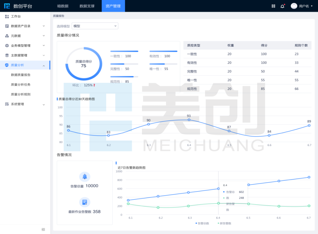 为保障绩效考核数据质量,基于美创自研的数据质控平台,实现了综合数据质控规则管理及自动化数据质控。平台内置数千条数据质控规则和逻辑,且同步更新国家平台最新的考核规则,可以从数据的完整性、唯一性、一致性、有效性、规范性、及时性等多维度,对数据源、数据归集、数据应用等全流程数据质量进行分类分级的量化评估。