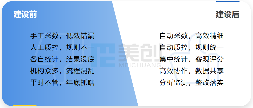对此美创从两个方面着手解决:一是数据采集规范化,按照数据整合规划,采用统一标准,通过统一平台与医疗卫生机构各业务系统对接,实现相关指标数据的最小颗粒度自动采集与处理,搭建可见、可管、可用的数据中心;二是构建丰富的考核评价结果和重点监测指标数据的分析和展示应用,将结果数据反馈给其他相关信息系统,逐步实现纵向全线贯通,横向全链联动的数字化绩效考核和绩效管理。