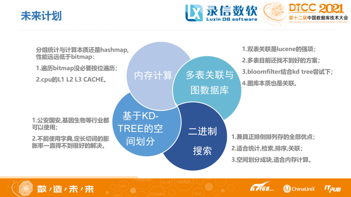 在分享的最后,母延年总结了一下LXDB未来的研发方向,基本可以归纳为“内存计算、多表关联与图数据库、基于KD-TREE的空间划分和二进制搜索”,在未来的研发中要在进一步拓宽产品的应用场景的同时,提升产品的性能表现。