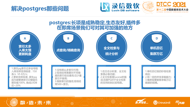 在随后的分享中,母延年阐述了为何选择PG作为新产品实践的底层基础,母延年将PG的优势概括为:“成熟稳定、生态友好、插件多,同时以公司目前的技术经验,能有效提升PG在即席场景的性能”,在对PG进行深度优化之后,基于PG实现了数据的极速入库,在点查询、全文检索、统计分析上也实现了突破。