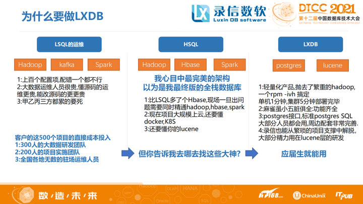 在分享的最初,母延年首先介绍了录信产品规划的心路历程,从处理万亿数据的LSQL开始,录信一直致力于解决大数据场景下多套组件混搭的问题,尽可量在降低系统复杂性的同时提升数据库本身的检索分析性能。但是基于Hadoop的LSQL配置复杂,造成了后期运维成本的高启。基于此,录信的第二代产品HSQL采用了Hadoop+Hbase+Spark的架构,母延年称这一技术架构堪称心中最终版的全栈数据库。但是由于HSQL架构上相比于LSQL多了Hbase,这使得在处理现场问题时难度更大,并且同时精通Hadoop、Hbase、Spark的技术人员稀缺,也正是因为这些问题限制了第二代产品HSQL的发展。基于这些因素,在录信的第三代产品LXDB的打造上,选择了轻量级的产品架构,做到了单机1分钟,集群5分钟的超短部署时间。在保证功能完备性的同时采用了标准SQL接口,也使得运维和使用成本大幅降低,研发人员可以更加专注于索引层的开发。