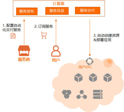 计算巢通过将应用发布为服务的方式,为服务商提供了一个智能简捷的服务发布和管理平台,覆盖了服务的整个生命周期,包括服务的交付、部署、运维等。计算巢集成了阿里云一系列底层产品能力, 将服务的交付、部署流程标准化,实现了自动化交付和部署,无需人工参与;服务上线后,用户能自主订阅服务,极大减少服务商的边际交付成本;服务部署后,计算巢提供阿里云自助服务和全链路检测能力,实现一键排查、智能故障检测,为部署在用户侧的企业服务提供代运维服务。