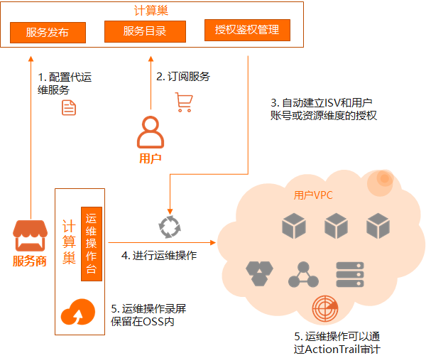 此外,计算巢也比传统的应用交付和运维方式更加安全可靠。基于极简网络联通设计,打通服务商与用户之间的网络,解决在运维时需要手动修改网络配置、交换登录凭证的困扰,杜绝安全隐患;通过安全授权和自动鉴权的方式,完成服务商和用户之间的授权,为两者建立安全的运维通道;服务流程可审计、可追溯,打造可信任的企业服务;同时,所有操作均被记录,资源操作通过ActionTrail记录日志,实例操作保留录屏,还原运维过程,做到运维安全合规可追溯,避免服务纠纷。