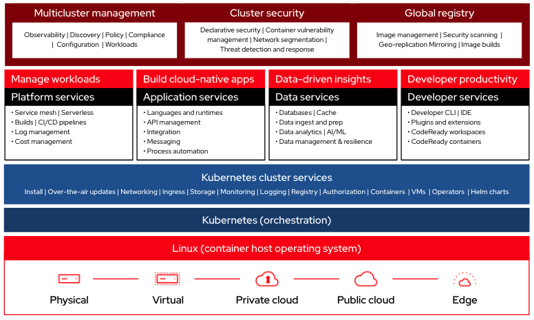 Openshift 的产品架构,是在 k8s 核心模块之上,划分出 4 大服务平台: