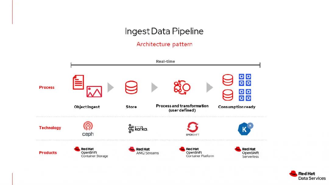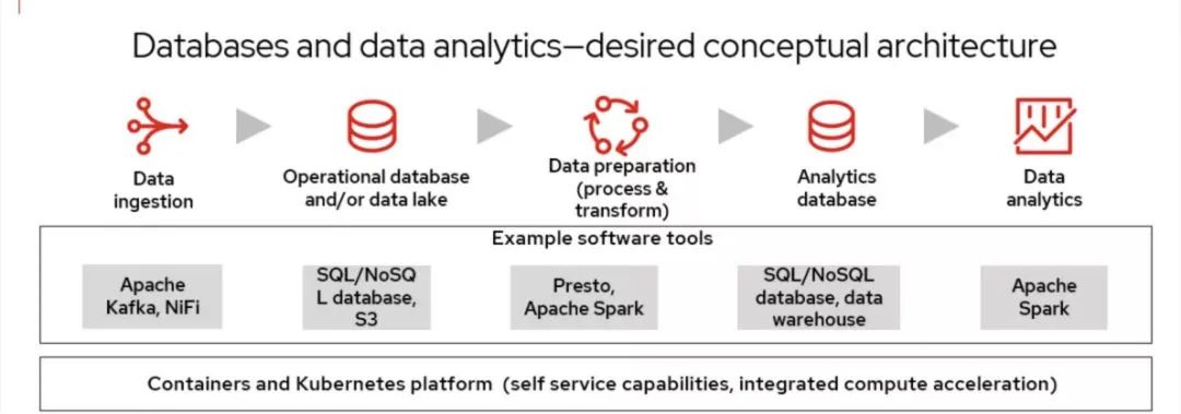 OpenShift 中,对数据的分析流程是如此定义的:数据串行从 kafka 到数据湖,从计算算子到分析库,从分析库到数据分析引擎,完成一个数据分析目标。