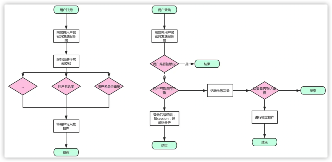 前端将用户名、密码发送到服务器,服务器进行常规的判断,判断用户名、密码长度是否满足,用户名是否重复等条件,条件不通过直接返回对应错误码给到前端,这里密码字段,为了防止传输过程中被截胡,建议加密再上传,我们的传输密码默认都是会进行一个md5加密,然后记录到数据库再进行一层加密,就算是脱库也没事,密码不要明文存储。 校验通过后,就将用户名密码写入数据库,并进行后面积分发放等操作,这里不展开。 现在进行登录,前端将用户名,密码发送给到服务端,服务端首先会校验登录次数是否超过设置的阈值,如果超过只能继续等待被关小黑屋。 如果未超过继续登录逻辑,判断用户名、密码是否正确,不正确密码则进行阈值的判断,如果超过则关小黑屋,记住小黑屋必须设置过期时间,要不然就会永久关上了,这个可以用redis的过期来做。 登录成功后进行后续的一切后置逻辑,比如加积分等操作。