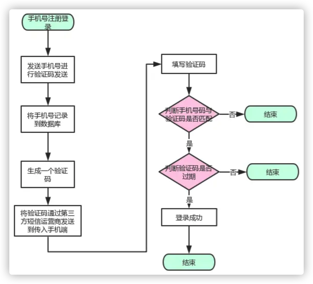 首先输入手机号,然后发送到服务端,服务端将手机号记录在我们数据库中,然后生成随机验证码,并将手机号和验证码绑定到一个redis里面,然后记录过期时间,这个过期时间一般是10分钟左右,这就是我们一般手机验证码的有效期。 手机接收到手机短信后,那么就在界面填写验证码发送服务端,服务端收到验证码后就会在redis里面查询到这个手机号对应的验证码,失败就返回错误码。 成功后就进行登录操作。