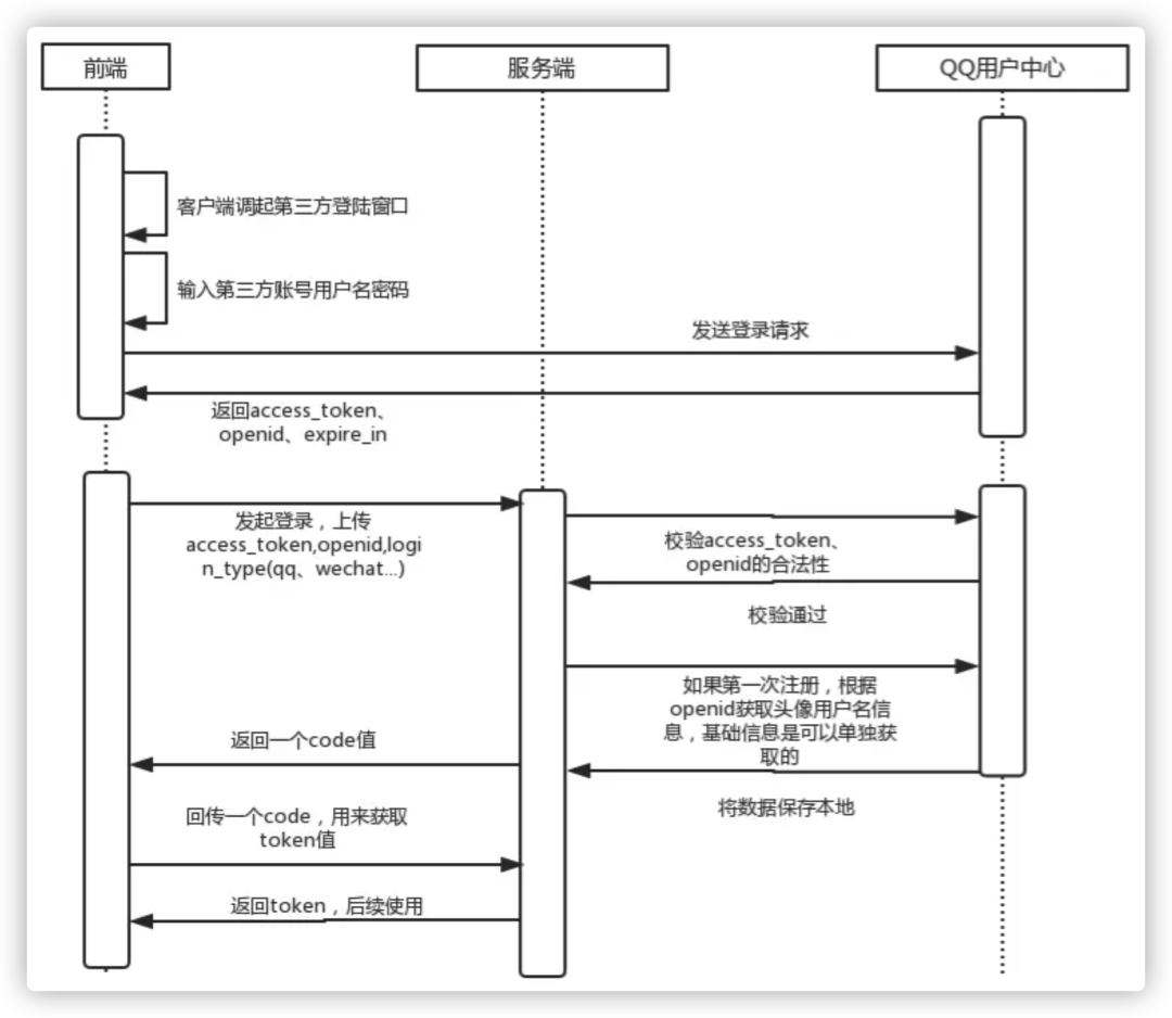 客户端自己调起登录的界面,进行输入用户名、密码,这里的是第三方的用户名,密码,登录成功后,会返回access_token,openid, expire_in,这过程会使用到oauth2.0,不过在sdk里面进行内置回调获取了,后面我们会说明我们自身实现的oauth2.0 客户端拿到access_token、openid、login_type(qq、wechat…)请求应用服务器,应用服务器拿到这些数据后就会根据对应的login_type去对应的用户中心进行access_token和openid进行校验。