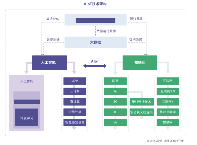 两者相结合,通过物联网产生、收集海量的数据存储于设备终端、边缘端或云端,再通过机器学习对数据进行智能化分析,以实现万物数据化、万物智联化。