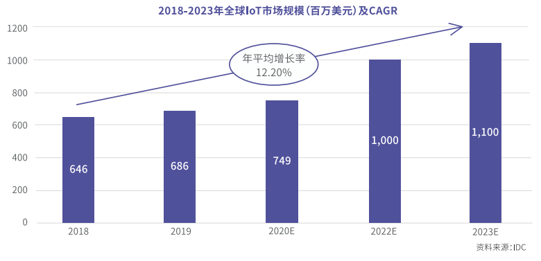 AloT行业市场规模的扩大,得益于人工智能技术在 loT应用领域的深化渗透。根据知名国际信息技术数据公司IDC的测算,2019年全球loT市场规模为6860亿美元,到2022年,这一数字将突破万亿美元;与此同时, 2019年全球通过万物互联传输的数据规模已达到14ZB。