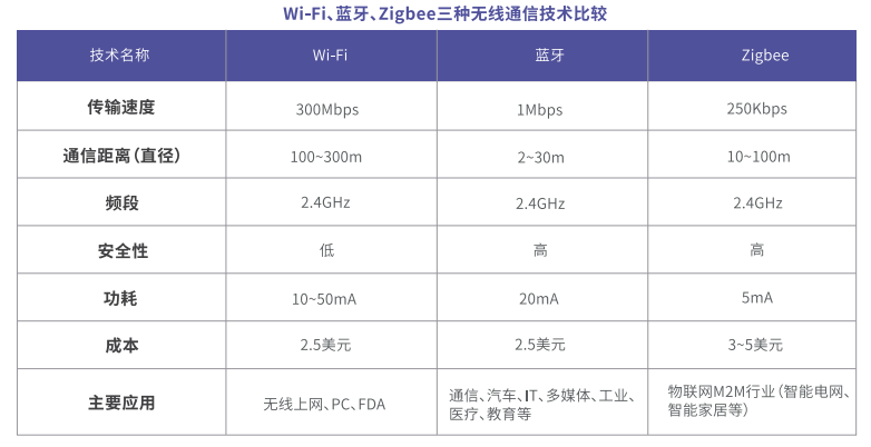 比较分析,Wi-Fi是目前应用最广泛的无线通信技术,传输速率最大;Zigbee的优势是自组网和低功耗,蓝牙的优势是组网简单。
