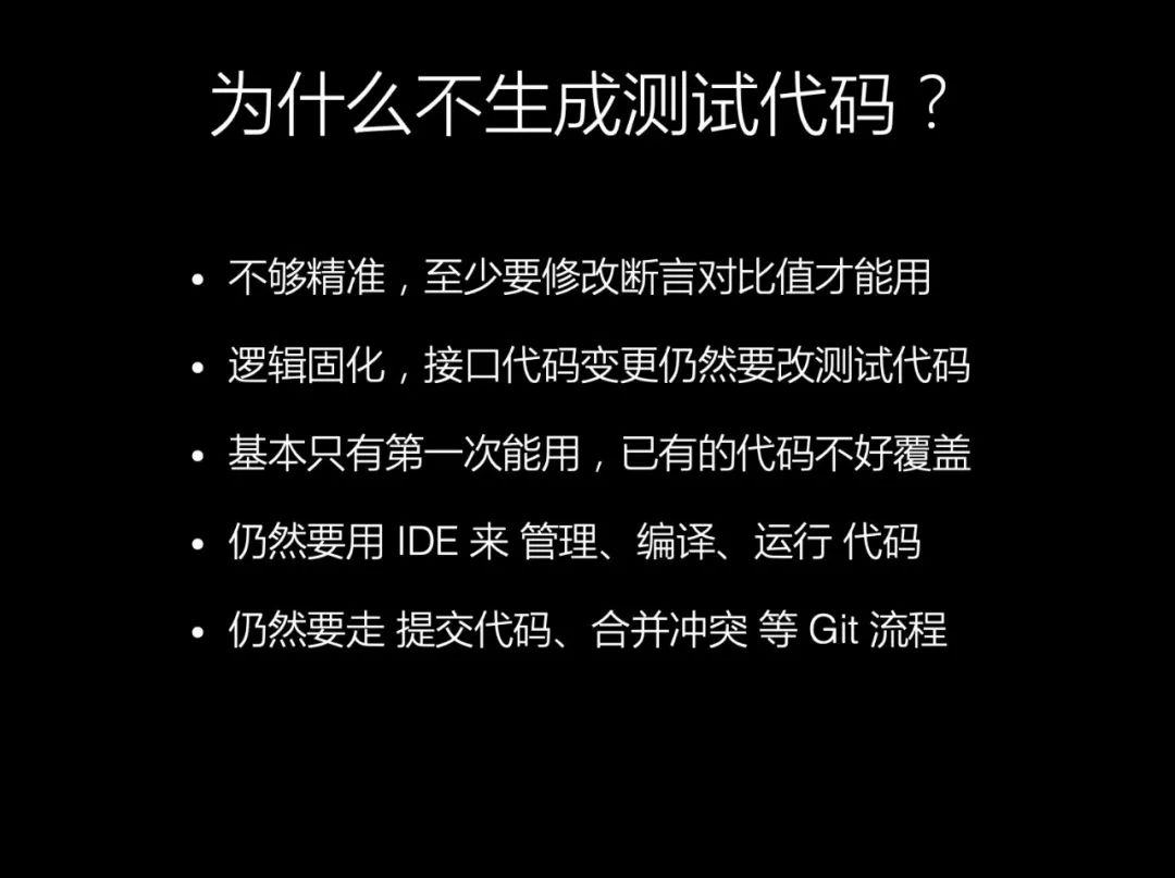 第一是不够精准,不能直接生成一个完整的符合自己业务需求的测试用例代码,至少要把用来对比的期望值改掉才能用;