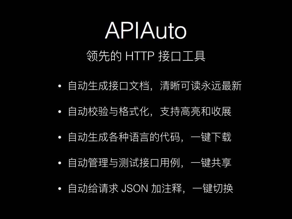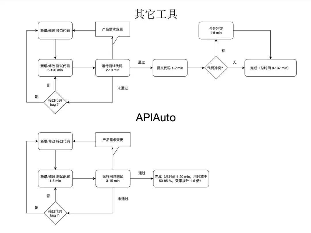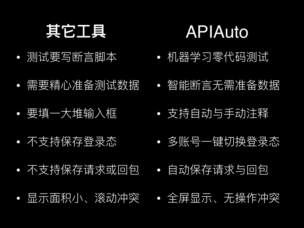 APIAuto 的机器学习测试使得接口回归测试不再需要编写测试用例代码、不再需要准备测试库构造数据,实现了在极低成本下达到一个很好的测试效果,相比业内各种需要 编写代码/填写表单/生成代码 的 工具/平台/框架/库 等,APIAuto 简化了测试流程并且大幅降低了测试的门槛和工作量。