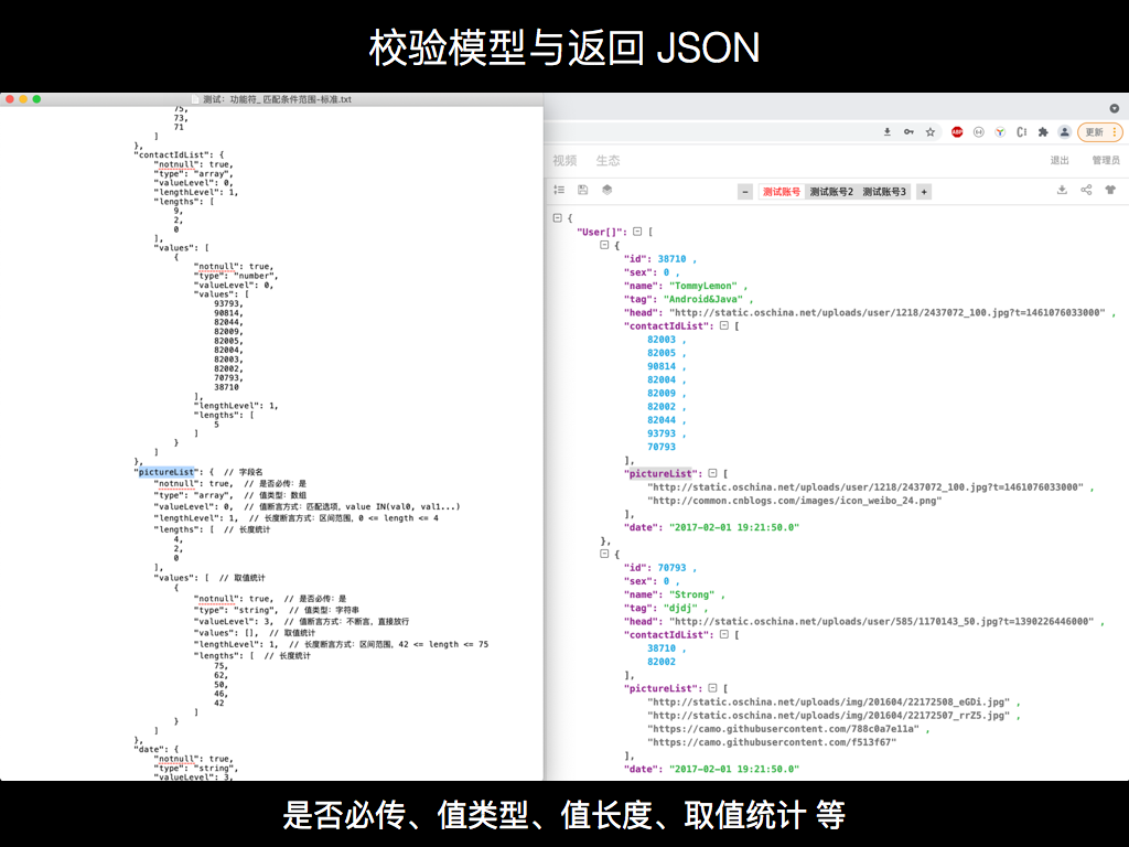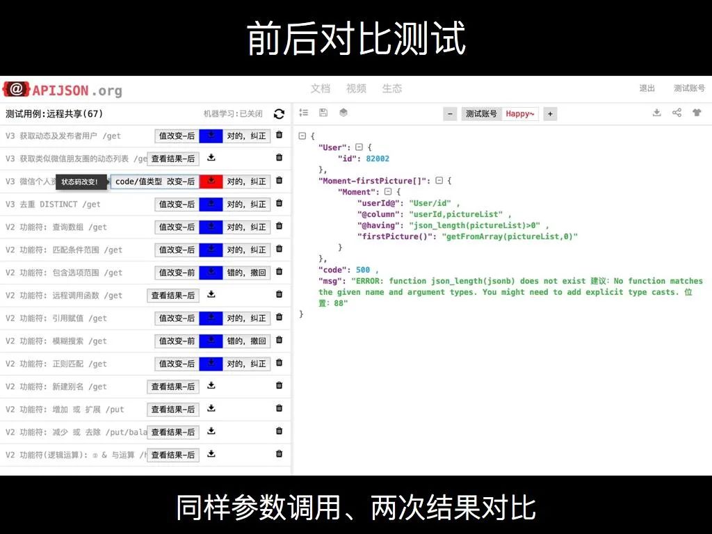 这个前后对比测试是这样的,用同样的参数调用同一个接口,我之前调一次,跟我现在调一次,前后两次。假设调用一个查询的接口,它是幂等的,数据也没变,那它两次返回的 Response JSON 应该完全一样。如果对比后发现某一层某个键值对和上次的不一样,那是不是说明出了某种问题?