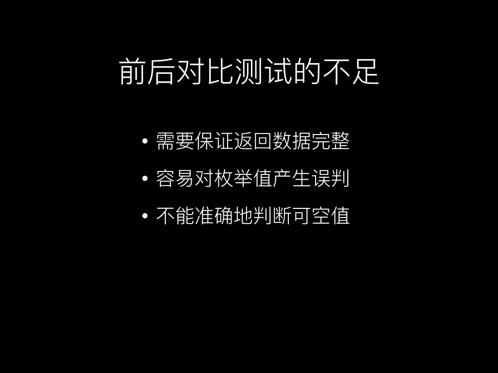 还有个就是不能准确的判断可空值,因为只和一次正确结果对比,根本不知道这些字段到底是不是可空(非必传)的。有些字段,上次有这次没有给你个黄色的警告,实际上可能本来就可有可无,有没有返回、是不是 null 都是正确的。