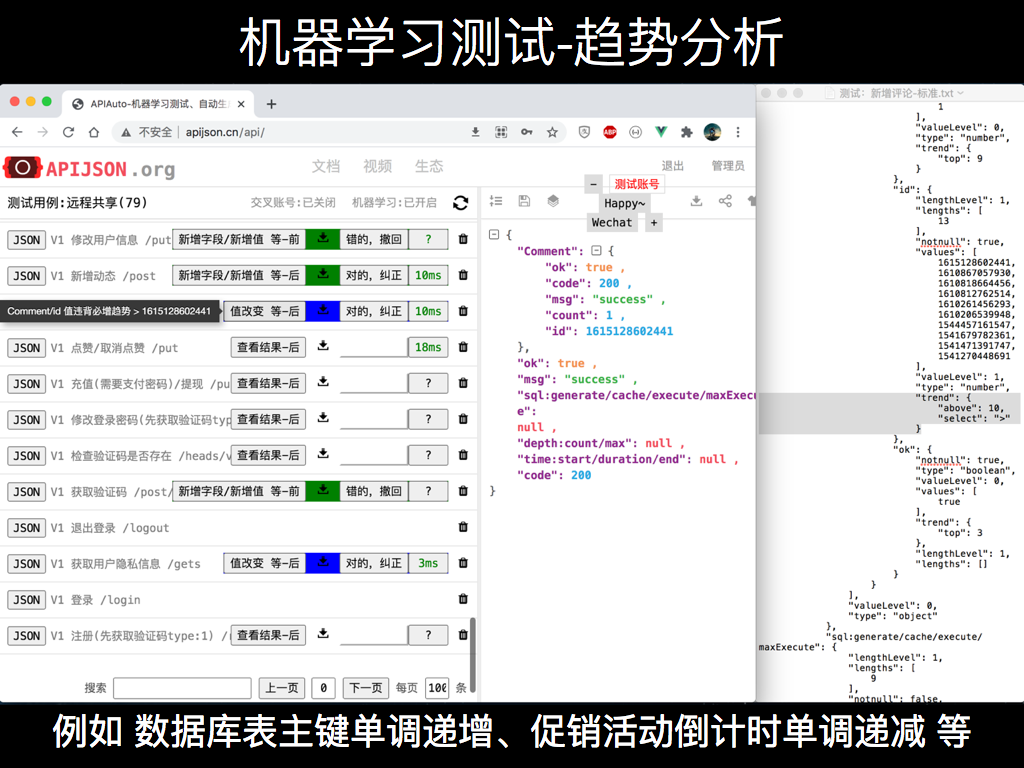 现在有很多接口加了 Redis 之类的内存缓存来保证性能,在 Redis 写成功了就直接返回成功 Reponse JSON 了,然后再异步去写数据库。这中间是有时差的,可能出现了某种异常情况,Redis 写进去了但数据库没有写进去。APIAuto 之前已经统计了评论 id 的一些值,例如统计到了 102,然后数据库出现了某种异常,他实际上的值只增加到了 100,后面的几个没有写进去。再用 APIAuto 去跑的时候,跑出来一个 101 并断言未通过,给了蓝色警告提示违背了必增趋势,这样就发现了接口的缓存及数据库读写的问题。
