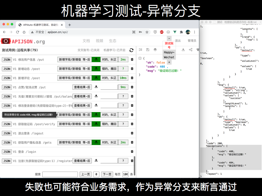 那么 APIAuto 是怎么解决的?它把第一次上传的正确结果作为是成功的结果,对应错误码是 0,然后再跑出来回包中错误码是 1,会给显示一个红色的警告,错误码/状态码 改变。然后你看了一下,其实这个回包也是没问题的,点一下 [对的,纠正],APIAuto 就把 1 加到 exceptions 这个异常分支,下次再跑出 1,只是显示一个绿色提示说明接口没问题,只是结果是失败的,可以忽略。对于这种失败也可能符合业务需求的情况,作为异常分支来断言通过,就不会误判。