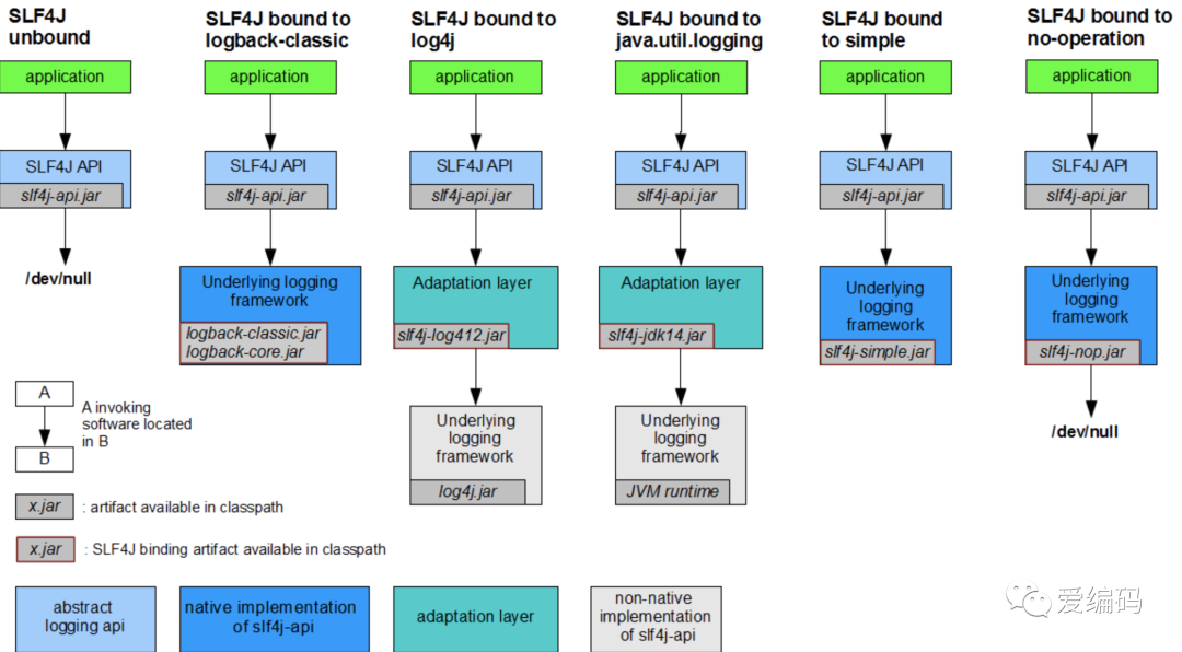 因为当时Java的日志组件比较混乱繁杂,Ceki Gülcü推出slf4j后,也相应为行业中各个主流日志组件推出了slf4j的适配 图来源于官方文档:http://www.slf4j.org/manual.html