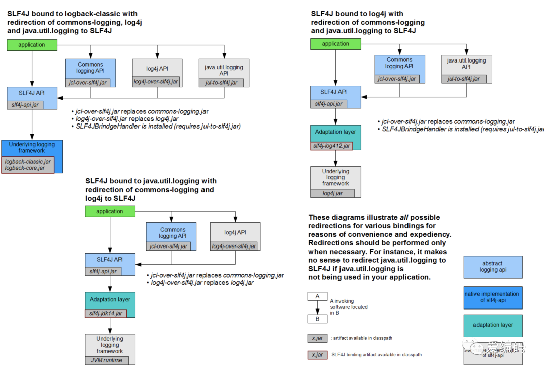 slf4j支持各种适配,无论你现在是用哪种日志组件,你都可以通过slf4j的适配器来使用上slf4j。只要你切换到了slf4j,那么再通过slf4j用上实现组件,即上面说的。图来源于官方文档:https://www.slf4j.org/legacy.html