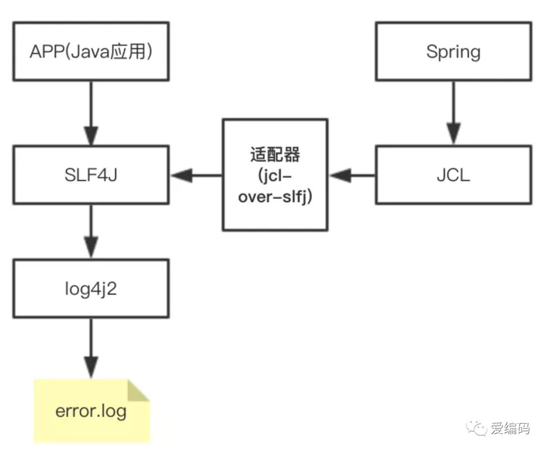 这就是为了对slf4j的适配做一个例子说明。Spring是用JCL作为日志门面的,那我们的应用是slf4j + logback,怎么让Spring也用到logback作为日志输出呢?这样的好处就是我们可以统一项目内的其他模块、框架的日志输出(日志格式,日志文件,存放路径等,以及其他slf4j支持的功能) 很简单,就是加入jcl-over-slf4j.jar就好了。我又盗了一个图来说明