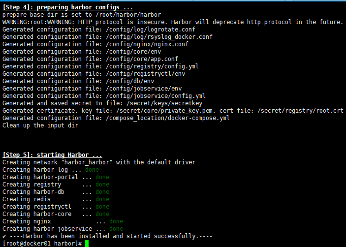 ##### 停止Harbor[root@docker01 harbor]# docker-compose downStopping harbor-jobservice ... doneStopping nginx ... doneStopping harbor-core ... doneStopping registryctl ... doneStopping redis ... doneStopping harbor-portal ... doneStopping harbor-db ... doneStopping registry ... doneStopping harbor-log ... doneRemoving harbor-jobservice ... doneRemoving nginx ... doneRemoving harbor-core ... doneRemoving registryctl ... doneRemoving redis ... doneRemoving harbor-portal ... doneRemoving harbor-db ... doneRemoving registry ... doneRemoving harbor-log ... doneRemoving network harbor_harbor##### 启动Harbor[root@docker01 harbor]# docker-compose up -dCreating network "harbor_harbor" with the default driverCreating harbor-log ... doneCreating registryctl ... doneCreating harbor-db ... doneCreating redis ... doneCreating registry ... doneCreating harbor-portal ... doneCreating harbor-core ... doneCreating nginx ... doneCreating harbor-jobservice ... done