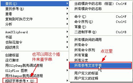 我们在反汇编窗口中右击,出来一个菜单,我们在 查找->所有参考文本字串 上左键点击: