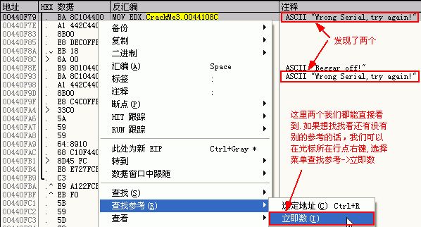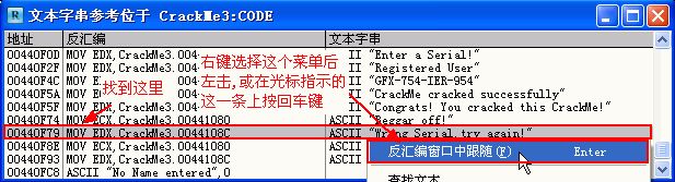 当然如果用上面那个 超级字串参考+ 插件会更方便。但我们的目标是熟悉 OllyDBG 的一些操作,我就尽量使用 OllyDBG 自带的功能,少用插件。好了,现在出来另一个对话框,我们在这个对话框里右击,选择“查找文本”菜单项,输入“Wrong Serial, try again!”的开头单词“Wrong”(注意这里查找内容要区分大小写)来查找,找到一处: