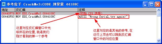00440F93 |. BA 8C104400 MOV EDX,CrackMe3.0044108C ; ASCII "Wrong Serial,try again!"