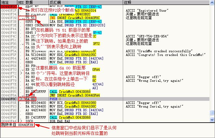大家注意看一下上面的注释,我在上面标了两个关键点。有人可能要问,你怎么知道那两个地方是关键点?其实很简单,我是根据查看是哪条指令跳到“wrong serial,try again”这条字串对应的指令来决定的。如果你在 调试选项->CPU 标签中把“显示跳转路径”及其下面的两个“如跳转未实现则显示灰色路径”、“显示跳转到选定命令的路径”都选上的话,就会看到是从什么地方跳到出错字串处的:
