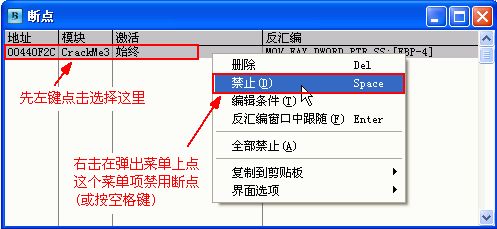 大家注意看一下,地址 00440F51 处的 CALL CrackMe3.00403B2C 和上面我们分析的地址 00440F34 处的 CALL CrackMe3.00403B2C 是不是汇编指令都一样啊?这说明检测用户名和注册码是用的同一个子程序。而这个子程序 CALL 我们在上面已经分析过了。我们执行到现在可以很容易得出结论,这个 CALL 也就是把我们输入的注册码与 00440F4C 地址处指令后的“GFX-754-IER-954”作比较,相等则 OK。好了,我们已经得到足够的信息了。现在我们在菜单 查看->断点 上点击一下,打开断点窗口(也可以通过组合键 ALT+B 或点击工具栏上那个“B”图标打开断点窗口):