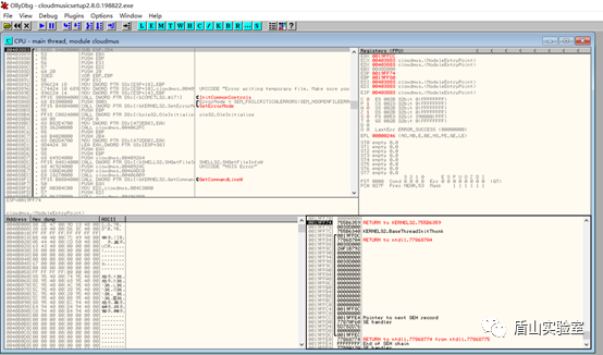 默认的当前窗口是CPU窗口,他在OD中是最重要的窗口,调试程序的绝大部分操作都要在这个窗口进行。他包含以下5个窗口: