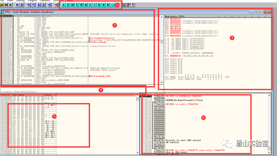 (2)CPU窗口的反汇编面板,也就是我们第2个标号的部分。