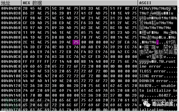 以十六进制和字符方式显示文件在内存中的数据,要显示数据可点击鼠标右键“go to expression”命令或按“Ctrl+G”键打开地址窗口,输入地址。