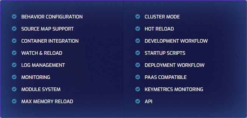 以上是官网站点上对PM2全特性的标签,上面的单词都很容易懂,就不做翻译了。如果你想了解更多相关特性的细节,可以前往 官方站点 首页查阅。
