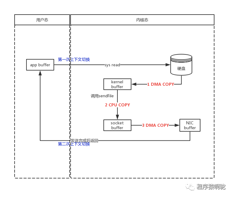 这个系统调用可以在内核态内把数据从内核缓冲区直接复制到套接字(SOCKET)缓冲区内, 从而可以减少上下文的切换和不必要数据的复制,如下: