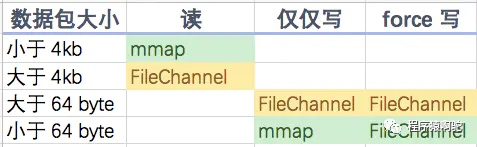 RocketMQ因为有小块数据传输的需求,因而选择了mmap。RocketMQ为了提高写的效率,也支持使用FileChannel(开启堆外缓冲区且使用异步刷盘且为Master节点时)。下面为网上别人测试得出的使用mmap和FileChannel的结果