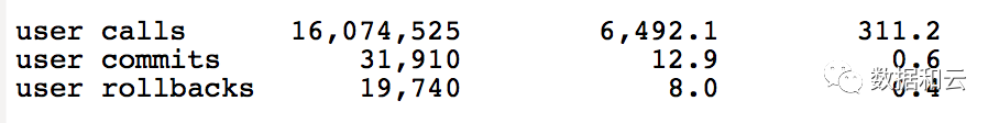 概要信息还包括每秒的事务数量(Transactions/s),对于以上的示例,这个数值是20.86,那么这个数据是从何处得来的呢?首先要知道采样阶段数据库的总的事务数量,这个值等于用户提交的事务(user commits)和用户回滚的事务(user rollbacks)总和。