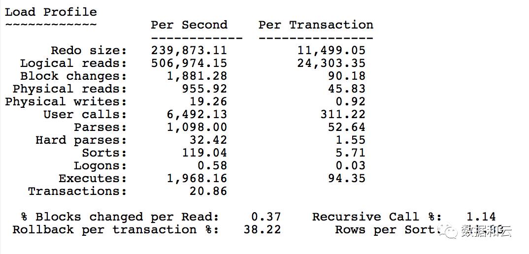 在数据库概要信息之后,报表中输出的是数据库的负载概要信息,这些信息分别通过每秒和每事务形式展现。通过这部分信息,报告讲数据库的整体运行状况快速展现出来。