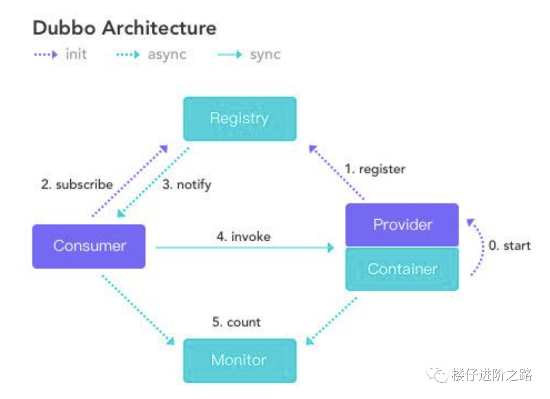 Consumer:需要调用远程服务的服务消费方 Registry:注册中心 Provider:服务提供方 Container:服务运行的容器 Monitor:监控中心