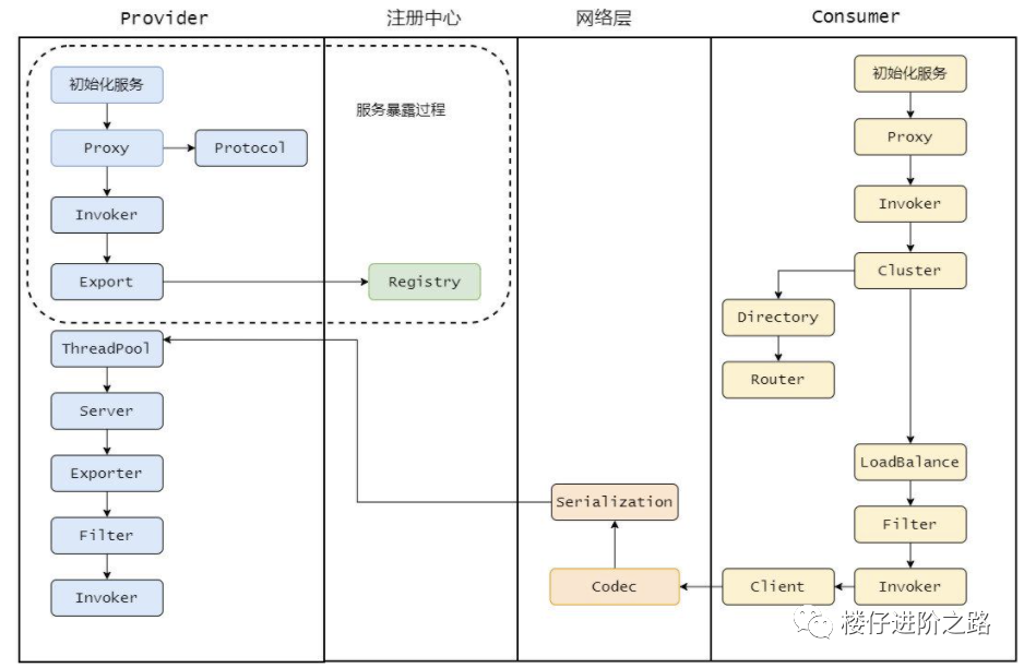 Service,业务层,就是咱们开发的业务逻辑层。 Config,配置层,主要围绕 ServiceConfig 和 ReferenceConfig,初始化配置信息。 Proxy,代理层,服务提供者还是消费者都会生成一个代理类,使得服务接口透明化,代理层做远程调用和返回结果。 Register,注册层,封装了服务注册和发现。 Cluster,路由和集群容错层,负责选取具体调用的节点,处理特殊的调用要求和负责远程调用失败的容错措施。 Monitor,监控层,负责监控统计调用时间和次数。 Portocol,远程调用层,主要是封装 RPC 调用,主要负责管理 Invoker,Invoker代表一个抽象封装了的执行体,之后再做详解。 Exchange,信息交换层,用来封装请求响应模型,同步转异步。 Transport,网络传输层,抽象了网络传输的统一接口,这样用户想用 Netty 就用 Netty,想用 Mina 就用 Mina。 Serialize,序列化层,将数据序列化成二进制流,当然也做反序列化。