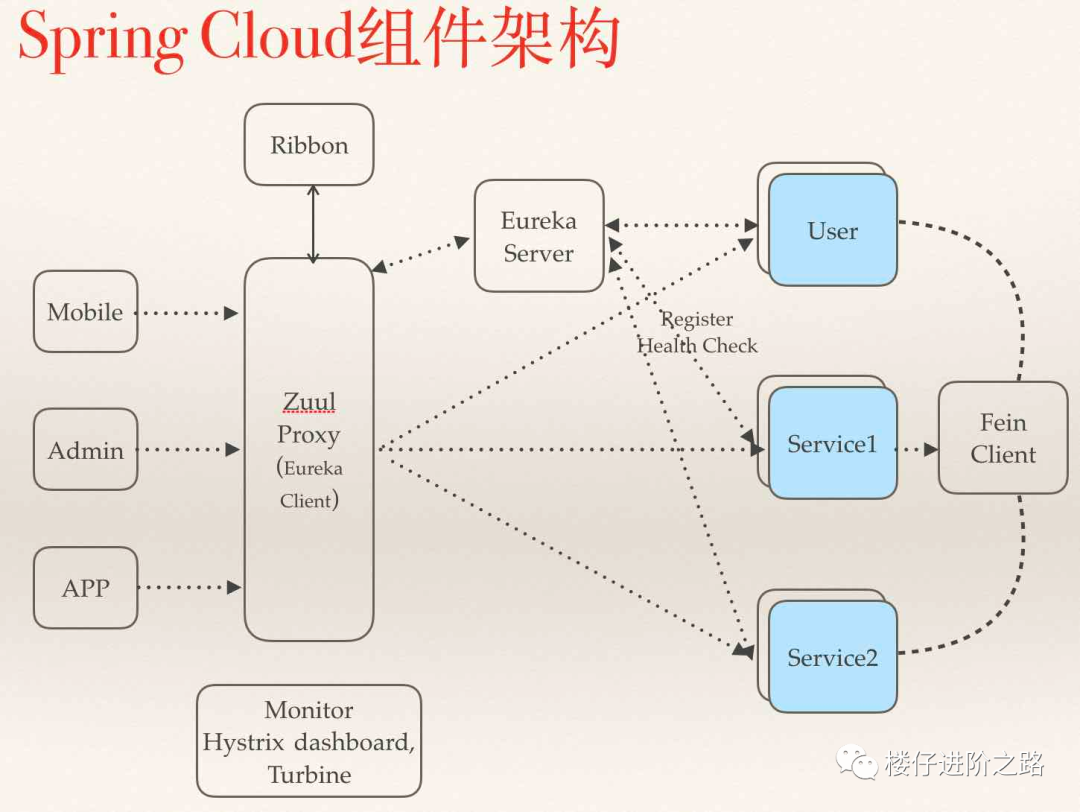 请求统一通过 API 网关(Zuul)来访问内部服务。 网关接收到请求后,从注册中心(Eureka)获取可用服务。 由 Ribbon 进行均衡负载后,分发到后端具体实例。 微服务之间通过 Feign 进行通信处理业务。 Hystrix 负责处理服务超时熔断。 Turbine 监控服务间的调用和熔断相关指标。