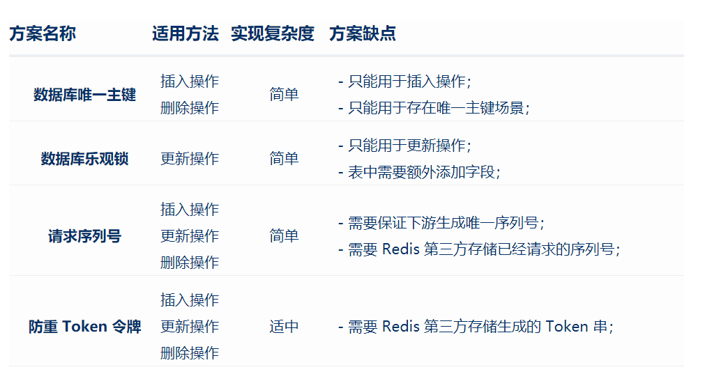 上面只是给与一些建议,再次强调一下,实现幂等性需要先理解自身业务需求,根据业务逻辑来实现这样才合理,处理好其中的每一个结点细节,完善整体的业务流程设计,才能更好的保证系统的正常运行。最后做一个简单总结,然后本博文到此结束,如下: