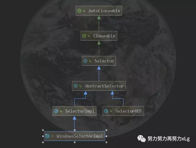 这里多提一嘴,因为Selector 的实现是根据操作系统来具体实现的,所以这里是WindowsSelectorImpl,如果在Lunix/mac下看到的不一样,也不用惊慌。