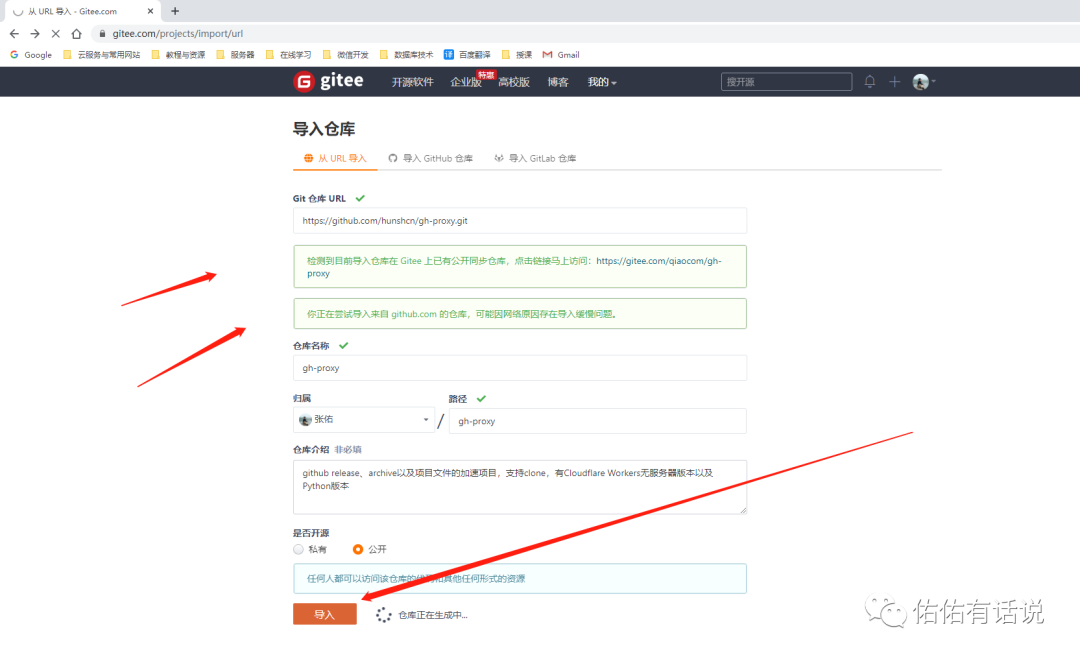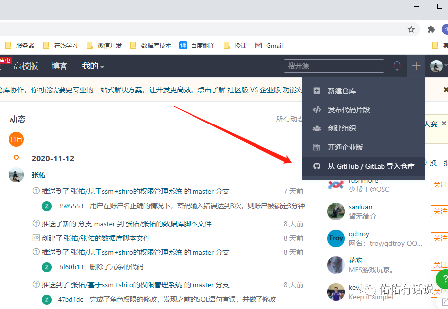 访问 gitee 网站:https://gitee.com/ 并登录,在顶部选择“从 GitHub/GitLab 导入仓库” 如下:佑佑有话说