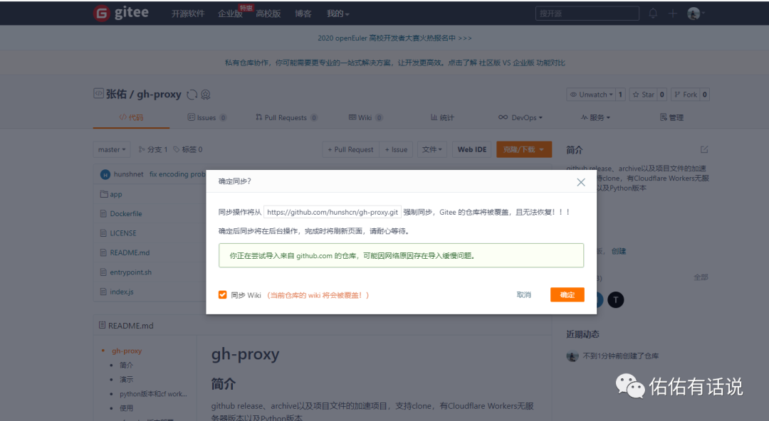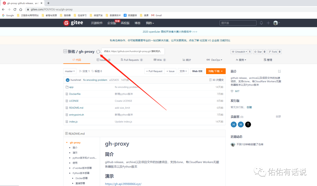 也就是说上面的镜像就是一个克隆版的 GitHub,你可以访问上面的镜像网站,网站的内容跟 GitHub 是完整同步的镜像,然后在这个网站里面进行下载克隆等操作。佑佑有话说佑佑有话说