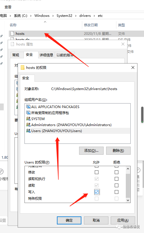 1、修改C:\Windows\System32\drivers\etc\hosts文件的权限,指定可写入:右击->hosts->属性->安全->编辑->点击Users->在Users的权限“写入”后面打勾。如下: