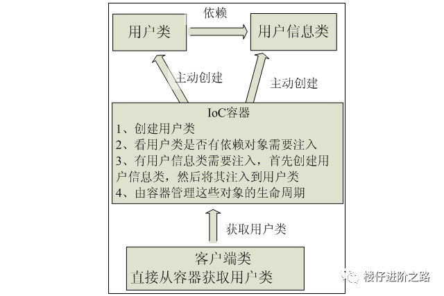 当有了IoC/DI的容器后,在客户端类中不再主动去创建这些对象了,如图所示: