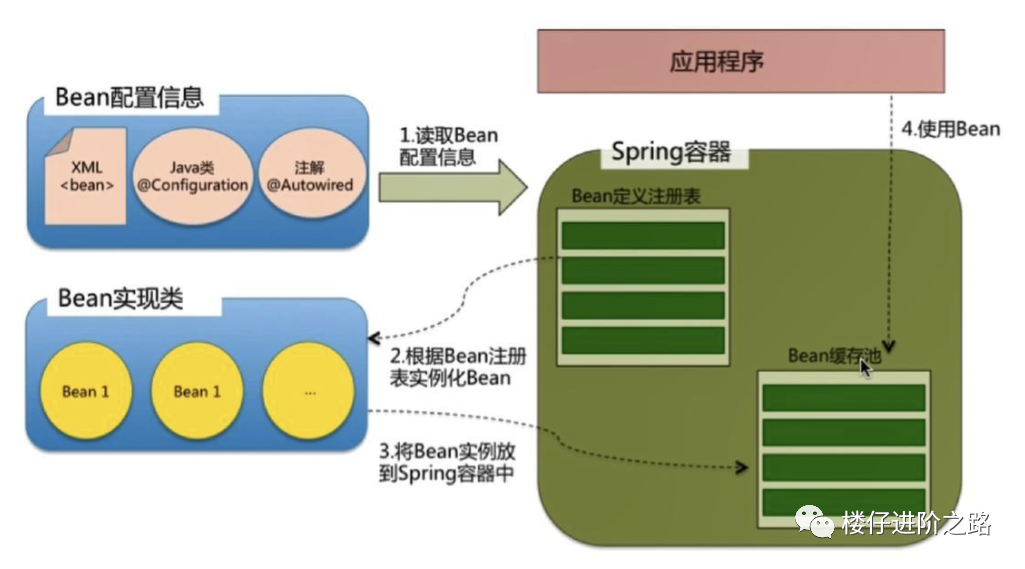 根据Bean配置信息在容器内部创建Bean定义注册表 根据注册表加载、实例化bean、建立Bean与Bean之间的依赖关系 将这些准备就绪的Bean放到Map缓存池中,等待应用程序调用
